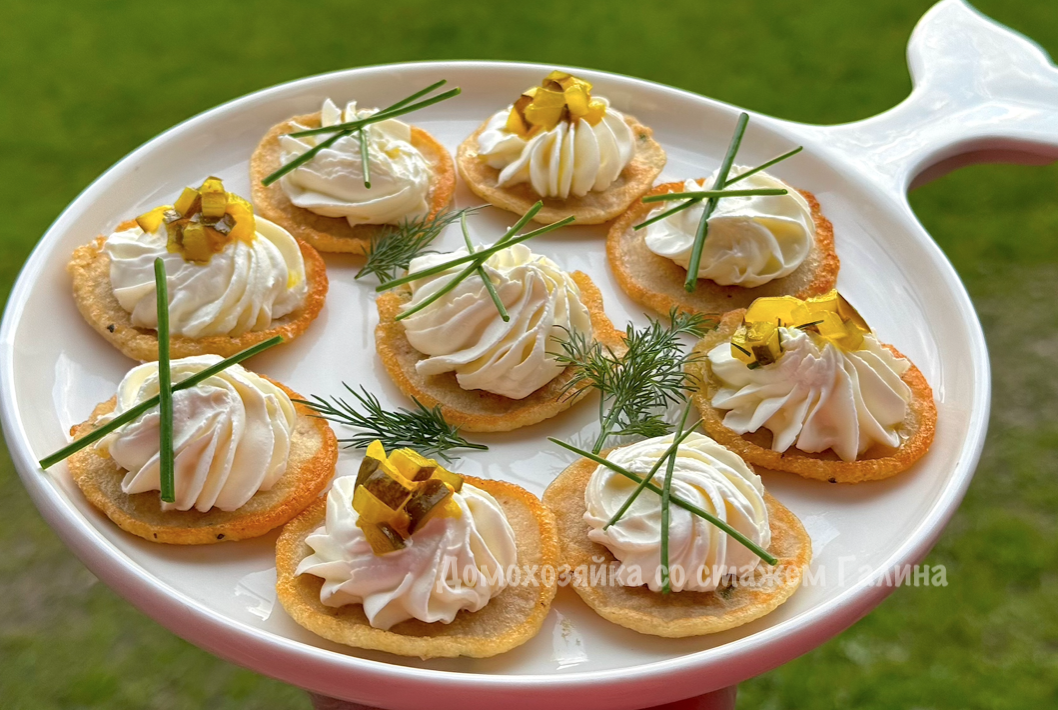 Готовые оладьи выкладывают на бумажное полотенце, чтобы убрать лишний жир. После чего на каждый оладушек аккуратно отсаживают творожный сыр и украшают огуречным релишем и шнитт-луком. Важно не перегружать закуску украшениями, чтобы не затмить вкус самой икры.