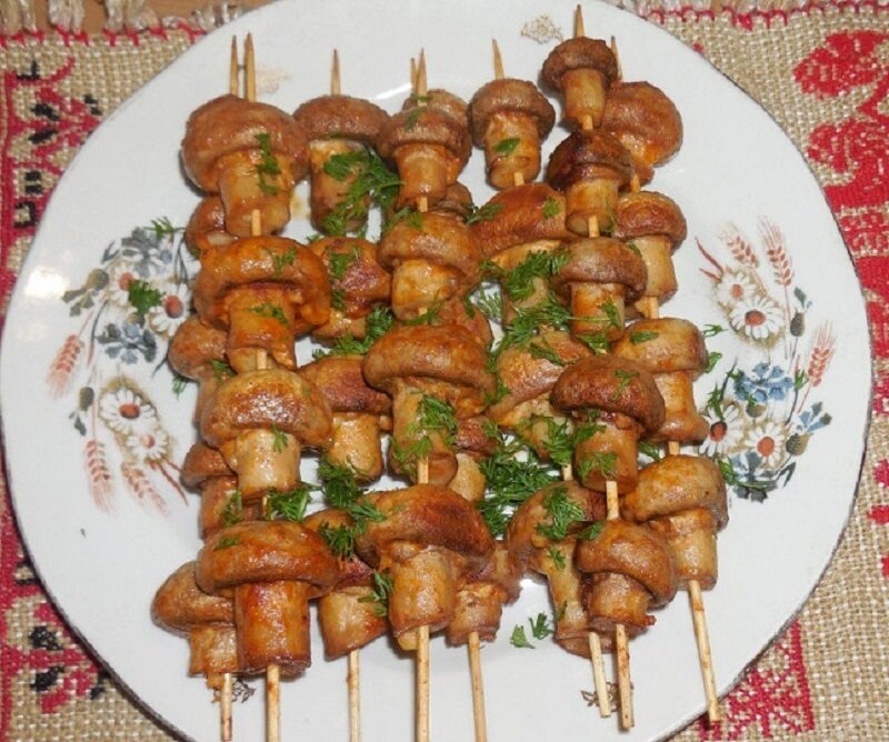 Такой шашлык может стать изысканным украшением любого праздничного стола, особенно для вегетарианцев и любителей грибных блюд. Он обязательно понравится всем вашим гостям. Приятного аппетита!