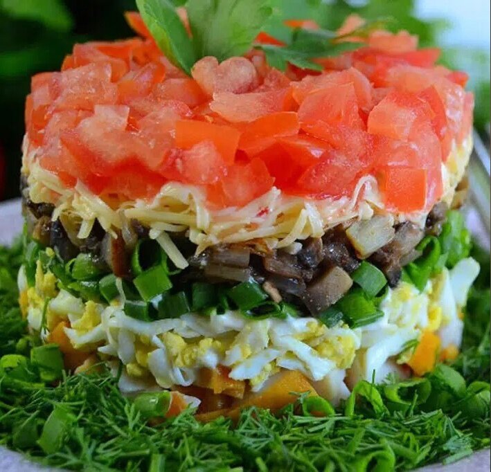 - Третий слой: обжаренные грибы с луком, снова майонез.