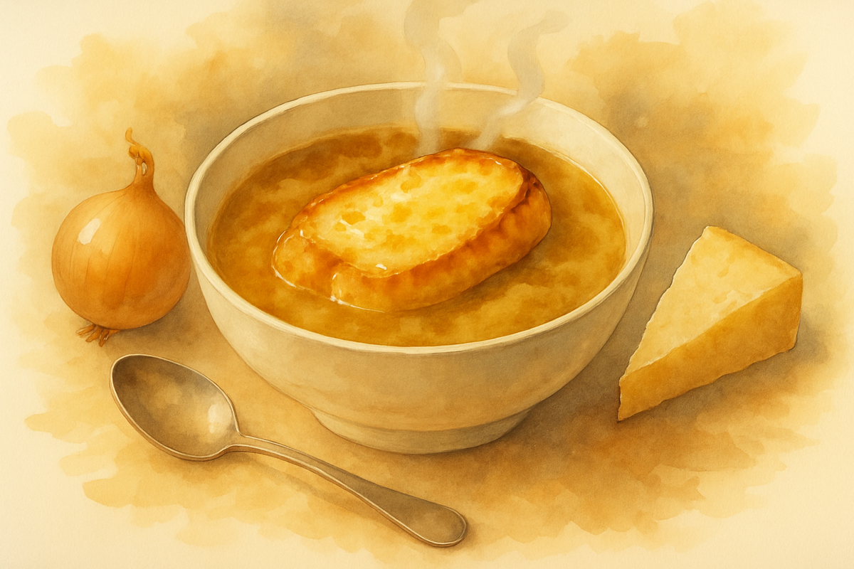 Традиционный французский луковый суп, известный как La Soupe ? l'Oignon, готовится из простых компонентов: обжаренного лука, бульона, соли и перца. Секрет его вкусного аромата заключается в томлении лука до золотистого цвета и насыщении бульона. Специально поджаренный хлеб, покрывающийся расплавленным сыром, стал неверным атрибутом этого блюда благодаря своему происхождению в парижских бистро XIX века.