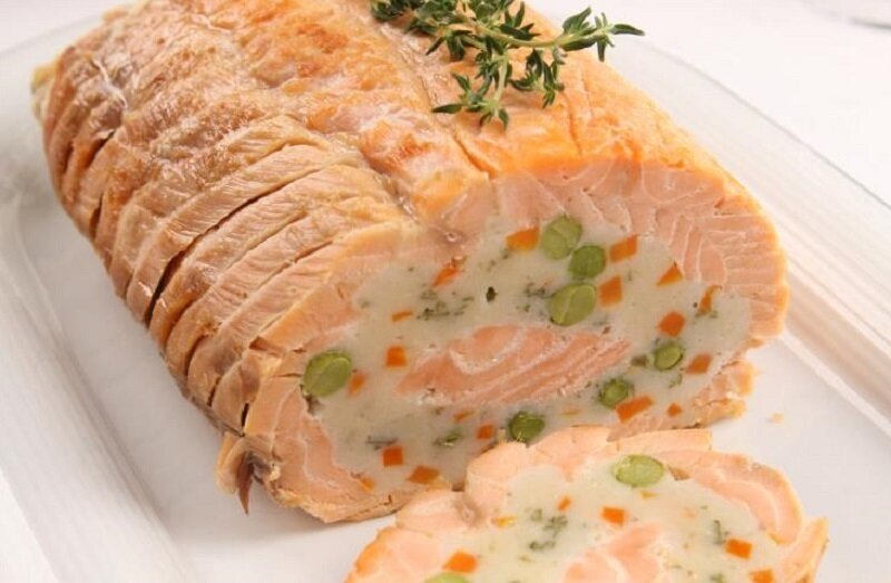 На длинный кусок укладывают половину начинки, сверху кладут брусок лосося, затем снова укладывают оставшуюся начинку. Закрывают меньшим куском и закрепляют края шпажками. Рулет смазывают растопленным сливочным маслом и заворачивают в фольгу. Запекается в разогретой до 200 °C духовке на протяжении 35 минут.