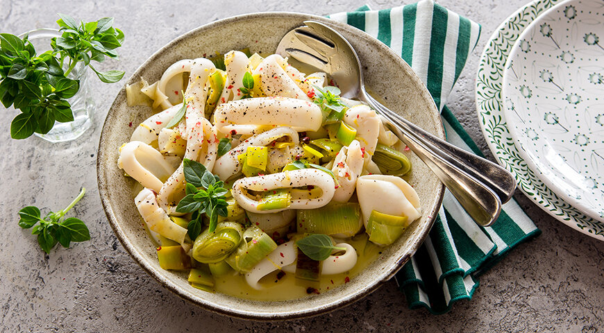 Кальмары великолепно гармонируют с томленым в масле луком-пореем. Для этого блюда важно использовать свежие, мягкие зеленые листья порея — они придают блюду неповторимый аромат и вкус.