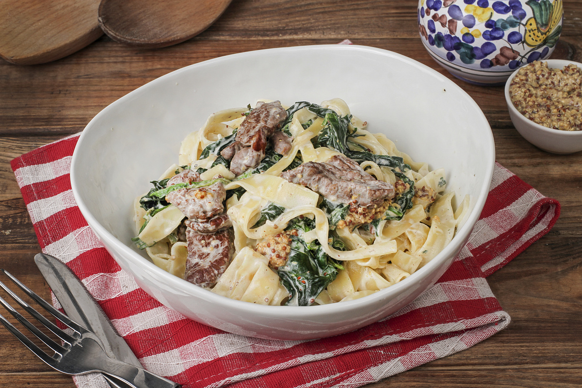 Вскипятить 1,5 литра подсоленной воды в большой кастрюле.Отварить фетучини в кипящей воде в течение 3 минут, затем откинуть на дуршлаг.Разогреть сковороду с 1 столовой ложкой масла и обжарить говядину на сильном огне в течение 3-4 минут до золотистой корочки.Добавить шпинат, уменьшить огонь до минимального и прогреть 1-2 минуты, пока шпинат не размягчится.Влить сливки, добавить зернистую горчицу по вкусу, а также посолить и поперчить компоненты.Держать на плите еще 1-2 минуты, чтобы соус немного загустел.Аккуратно смешать отваренные фетучини с соусом и говядиной, выключить плиту.Подавайте горячим, наслаждаясь каждой ложкой!Эта паста станет отличным дополнением любого обеда или ужина. Спешите порадовать себя и близких незабываемым вкусом!