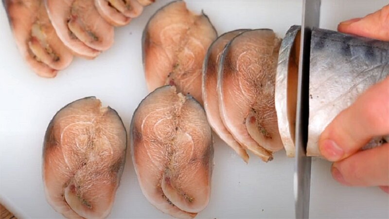 Начинать следует с подготовки рыбы: скумбрию необходимо разрезать на филе, убрав все кости. В отдельной миске смешать все специи, соль и сахар, добавив измельченный чеснок. Все ингредиенты тщательно растереть в однородную массу.