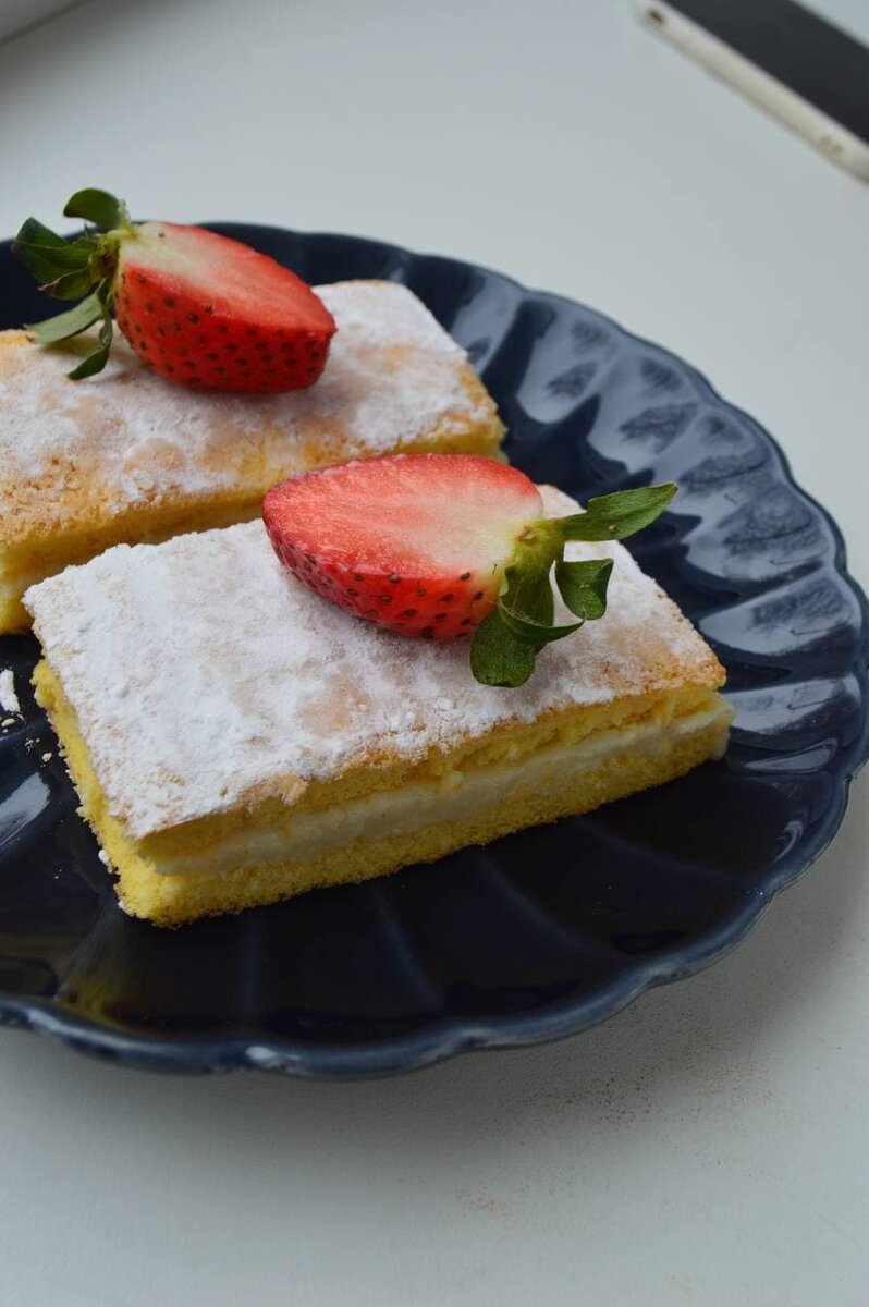 Для сборки десерта обрежьте бисквит по краям для ровности и нарежьте на 6 равных прямоугольников.Обмотайте форму пленкой пищевой, выложите на дно три кусочка бисквита, добавьте крем и накройте оставшимися кусочками.Уберите десерт в холодильник на 3-4 часа для застывания.Этот легкий, но сытный десерт готовится быстро и порадует даже самых взыскательных сладкоежек. Поделитесь своими результатами!