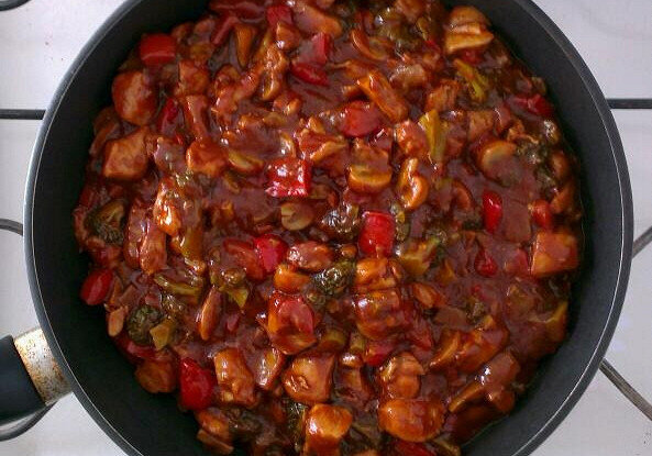 Приготовьте соус: в миске соедините томатную пасту, 4 столовые ложки оливкового масла, соевый соус, уксус, соус чили или перец, сахар и крахмал. По желанию добавьте немного воды для нужной консистенции.Подготовьте ингредиенты: нарежьте куриное филе, грибы, и болгарский перец небольшими кусочками. Брокколи погрузите в кипящую воду на 5 минут и разделите на соцветия. Чеснок нарежьте мелко.Обжарьте курицу и овощи: в большом сотейнике с толстым дном разогрейте оставшееся оливковое масло. Обжарьте куриное филе и грибы, если образуется лишняя вода, слейте ее. Затем добавьте перец, брокколи и чеснок, готовьте еще 5 минут, периодически помешивая.Залейте соусом: смешайте все приготовленные ингредиенты и тушите 5–7 минут на среднем огне.Подавайте к столу: подавайте с вареным рисом. По желанию можно добавить зеленую фасоль для разнообразия.Этот рецепт обязательно понравится не только вам, но и вашим друзьям! Не стесняйтесь делиться ним в социальных сетях и готовьте вместе с близкими.