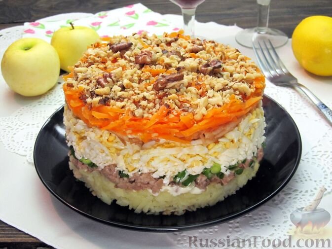 Сочетание куриного филе и грецких орехов – это всегда выигрышный вариант. Мелкие кусочки поджаренного куриного мяса отлично гармонируют с нежной сладостью хурмы и ароматным красным луком. Кстати, масляно-уксусная заправка добавляет свежести, подчеркивая сладкие ноты. Это простой, но элегантный салат, который украсит ваш обеденный стол.