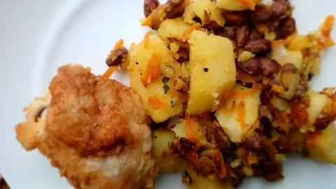 3. Завершение блюда. Теперь пришло время добавить фасоль. Слейте жидкость из банки и добавьте ее к овощам. Хорошо перемешайте и обжаривайте еще пару минут, добавив по вкусу соль и специи. Затем аккуратно добавьте в сковороду готовый картофель, предварительно разделив его на более мелкие кусочки. В завершение добавьте зелень и черный перец.
