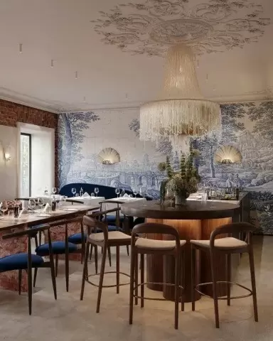 Интерьер бистро вдохновлен очарованием портовых городов Средиземноморья. Гостей радует стена, выложенная традиционной плиткой азулежу, а рядом — вязаное панно, изображающее красоту морского дна. Это не только эстетичное оформление, но и дань наглядному искусству морского края.