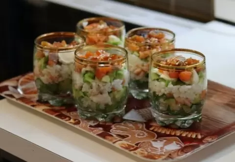 Порционный салат в стаканах станет настоящим украшением любого торжества. Его вкус близок к роллам, а сам процесс приготовления прост и быстрый. Вот, что потребуется на 6 порций: