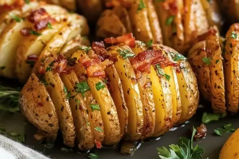 Картошка-гармошка с беконом — идеальное сочетание простоты и изысканного вкуса. Румяная, сетываюшая аппетитным ароматом, с расплавленным сыром и нежными ломтиками бекона, это блюдо отлично подойдет как для повседневного ужина, так и для праздничного застолья.