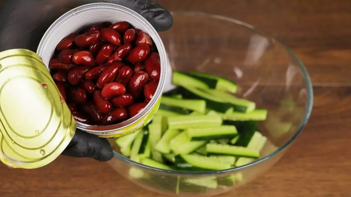 Свежий огурец нарезают на длинные брусочки и помещают в большую миску. Когда курица остынет, ее также нарезают мелче и отправляют к огурцам. К моркови по-корейски сливают лишнюю жидкость и добавляют в общую массу. После этого открывают банку фасоли, сливают жидкость и добавляют бобы к остальным ингредиентам. По вкусу подправляют солью и перцем, а затем заправляют салат майонезом.