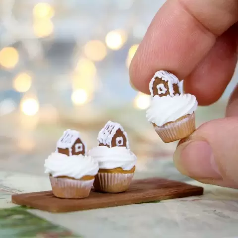 На вершинах этих сладостей разместились крошечные домики, словно сошедшие с рождественских открыток. Их крыши укрыты белым сахарным «снегом», который придаёт капкейкам атмосферу зимней сказки и уюта. Вокруг домиков переливаются легкие «снежинки», которые будто были принесены зимним ветерком, добавляя всему композиции лёгкость и воздушность.