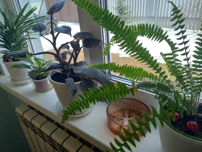 У входной двери первенствует красивый папоротник, которому удалось адаптироваться и прижиться. Укоренённый из отростка, за год он успел вырасти на несколько веток. Этот зелёный красавец не боится ни прохожих, ни потока людей, что говорит о его невероятном упорстве.