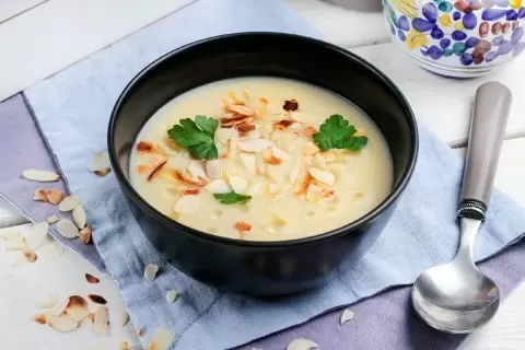 Польза миндаля известна ещё с древнегреческих времён. Он считается приносящим удачу и радость, а изделия из миндаля часто были изысканным угощением на свадьбах. Миндальное молоко, к тому же, является отличной альтернативой традиционному молоку — оно не содержит лактозы и прекрасно дополнит суп своим нежным привкусом.