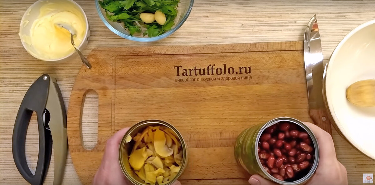 Для начала требуется лишь два ключевых ингредиента — банки с фасолью и грибами. После того как жидкости из них будут слиты, грибы и фасоль стоит высыпать в большую миску. Ускоренный процесс приготовления можно дополнить свежей зеленью, добавив нарезанную петрушку. Она придаст салату аромат и свежесть.