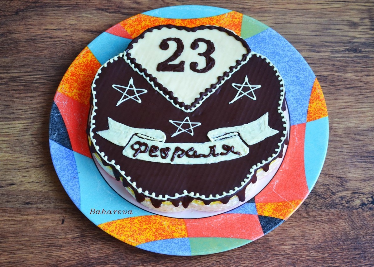 Напишите название месяца на белой ленточке — и ваш тортик готов! Его можно подавать сразу или оставить на несколько часов для лучшей пропитки. По желанию, этот десерт станет настоящей находкой в меню для любимых мужчин. Пробуйте и наслаждайтесь!