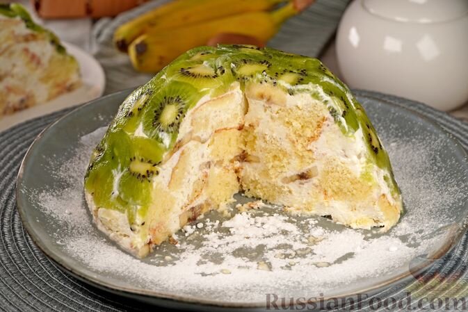 Первым на очереди стоит торт "Панчо" с киви и бананами. Этот бисквитный шедевр радует не только вкусом, но и аппетитным внешним видом. Сметанный крем, сочетание бананов и киви делают его идеальным выбором для летнего или осеннего застолья.