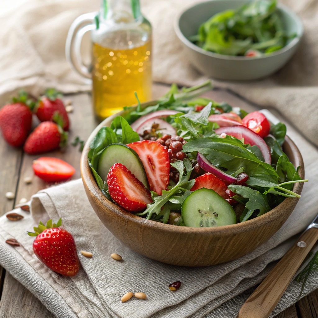Каждый из нас знает, что зелень — это не просто аксессуар к основному блюду. Сегодня в центре внимания освежающие салаты, которые мгновенно перенесут вас в летнее настроение благодаря клубнике и рукколе. Вкусные и полезные, их можно подавать в качестве легкого перекуса или здорового ужина. Клубника приносит не только освежающий вкус, но и витамин C, в то время как руккола добавляет небольшую остроту и насыщает витаминами K. Идеально для восстановления после тренировки — антиоксиданты, легкие углеводы и растительный белок (с добавлением бобовых или тофу) сделают ваши мышцы счастливыми.