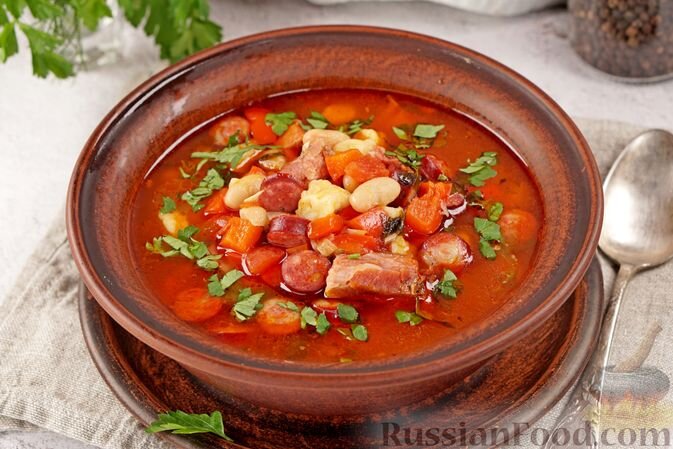 - Томатный суп с копчёностями и фасолью: Этот наваристый венгерский суп отличается ароматом копчёной паприки и наличием мини-клёцок чипетке.