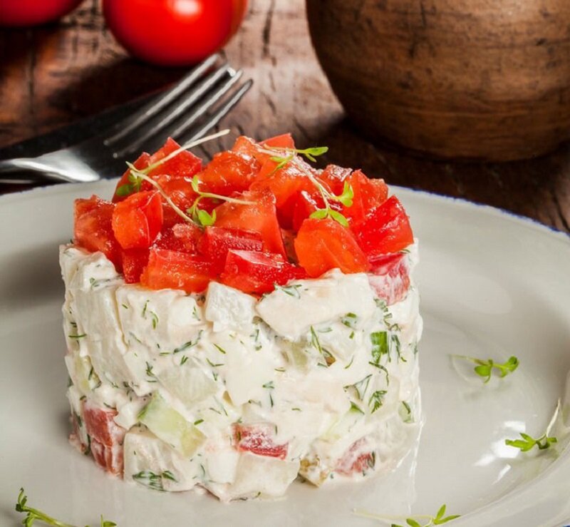 Во Франции такой вариант оливье обычно подают в большой салатнице, дополняя ломтиками черного хлеба и добавляя все виды помидоров в общую массу. Это делает блюдо не только на вкус, но и по эстетике еще более привлекательным.