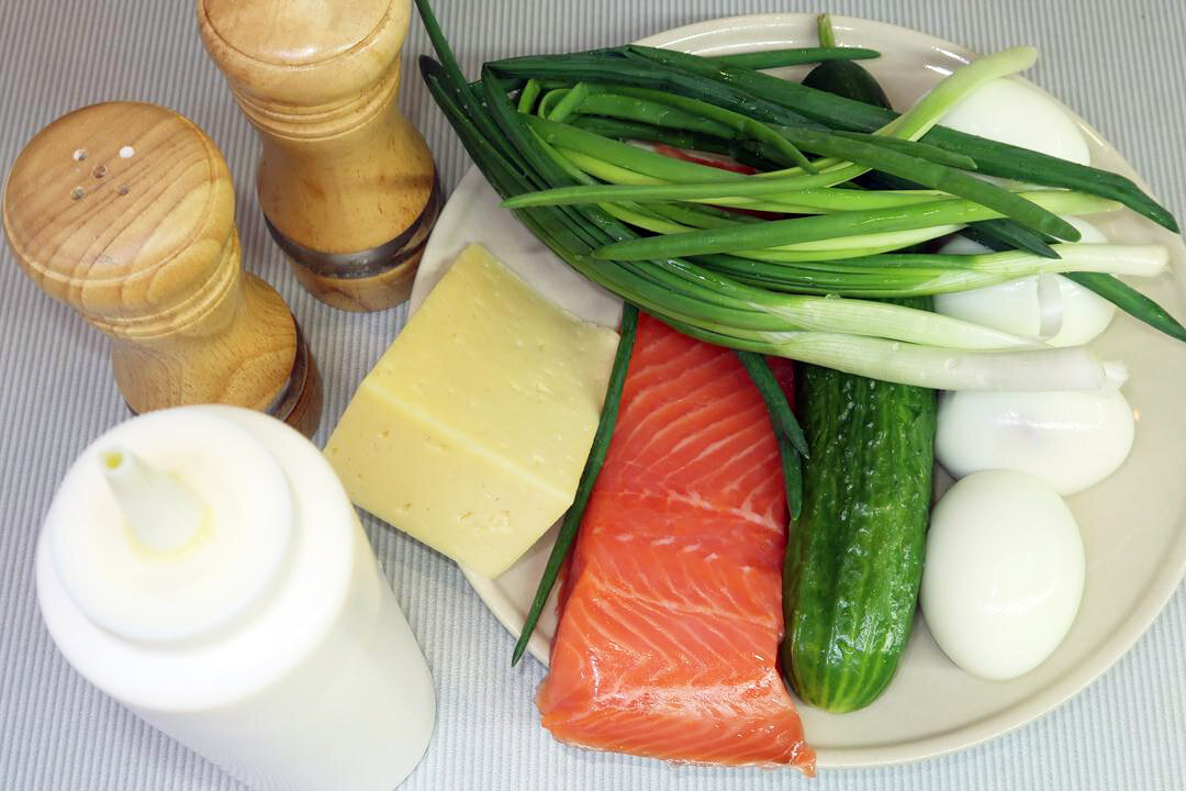 Предлагаем вам порадовать своих близких лёгким и вкусным салатом с форелью, сыром и хрустящими огурчиками. Это блюдо готовится мгновенно и моментально исчезает со стола, радуя всех своим необычным вкусом. Красная рыба, известная своим изысканным вкусом, здесь сочетается с зелёным луком, отварными яйцами и сливочным сыром, создавая поистине нежное лакомство. А добавление свежих огурцов вносит необходимую свежесть, идеальное дополнение к более насыщенным компонентам. Все ингредиенты можно так же удобно подавать в тарталетках, а простая подача слоями с использованием кулинарного кольца придаёт блюду элегантный вид.