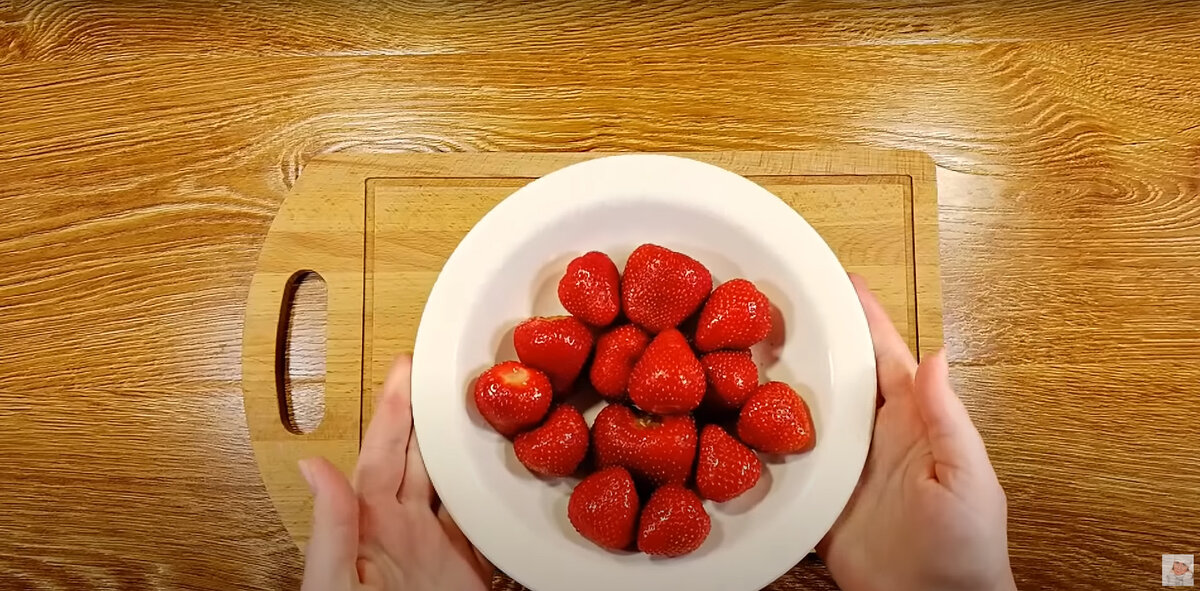 Рецепт взят от подписчицы по имени Настя, но с небольшими авторскими изменениями. Первым делом клубнику следует тщательно промыть и удалить плодоножки, после чего нарезать на мелкие кусочки. Затем, чтобы добиться текстуры блюда, клубнику необходимо заморозить. Для этого положите подготовленные кусочки в морозильник на 2 часа.