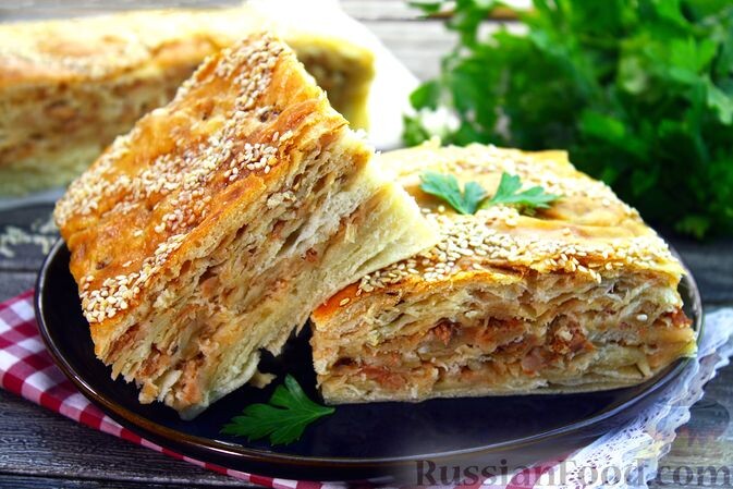 - Многослойный пирог с картофелем и мясом: Это оригинальное блюдо включает в себя тонкие пласты теста, завернутые с начинкой из фарша и картофеля, создавая удивительно богатый по вкусу пирог.
