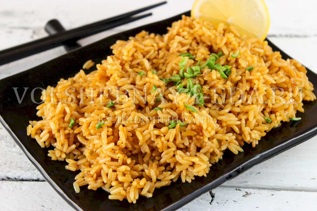 Такой жареный рис идеально украшает блюда из морепродуктов, особенно с креветками, а также может быть основой для овощных смесей. Он станет отличным гарниром, особенно если добавить к нему дольку лимона и свежий зеленый лук.