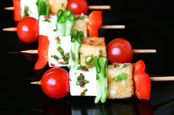 Теперь, когда все ингредиенты подготовлены, пора собирать канапе. Для этого пригодятся длинные шпажки или деревянные шампуры. На каждую шпажку по очереди нанизываем: сначала перец, затем хлеб (предварительно обмакнув в маринаде), складываем цукини гармошкой и накалываем, добавляем кубик моцареллы, аккуратно вынутый из маринада, и завершаем помидоркой черри.