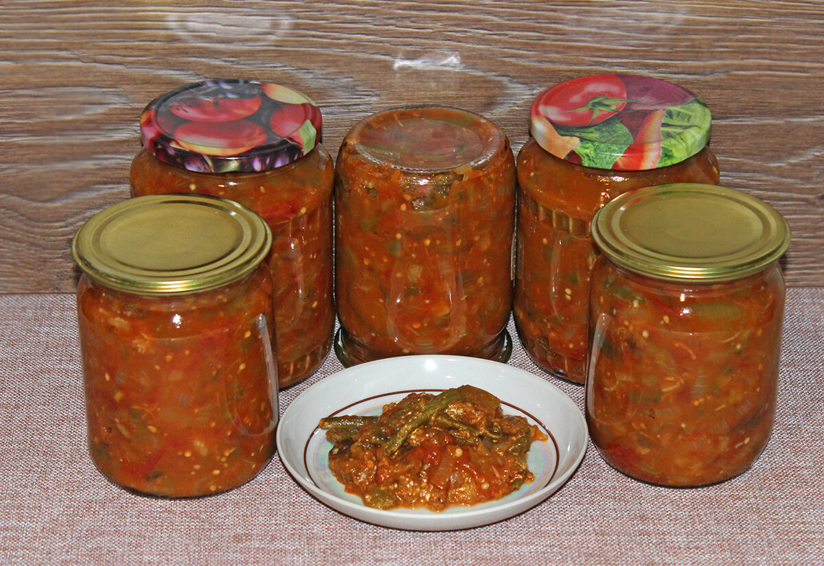 Теперь в кастрюлю добавляют баклажаны, фасоль и лук, а сверху выкладывают нарезанные дольками томаты. Вводят соль, сахар и тушат смесь в течение 30 минут. Затем добавляют мелко нарезанный чеснок, специи и продолжают тушить еще 5 минут. В завершение вливают уксус, хорошо перемешивают, и горячую массу раскладывают по стерильным банкам, закатывая крышками.