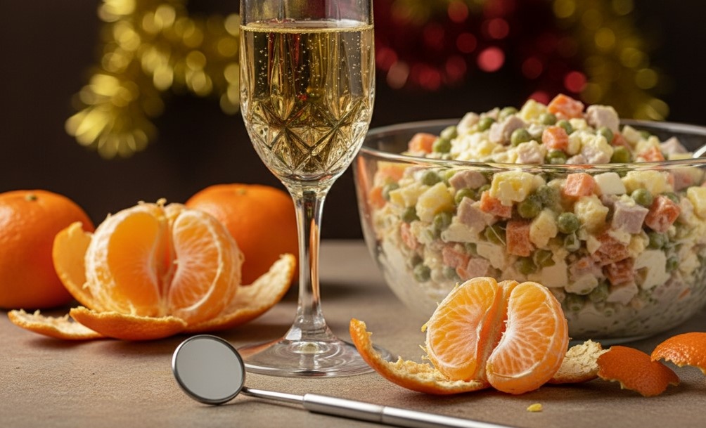 Зубные неприятности часто возникают из-за популярного шампанского, мандаринов и, казалось бы, безобидного салата оливье. Профессиональный стоматолог Магомади Халилбеков рассказал о том, как избежать проблем с зубами на праздниках и встречать 2026 год с широкой улыбкой.