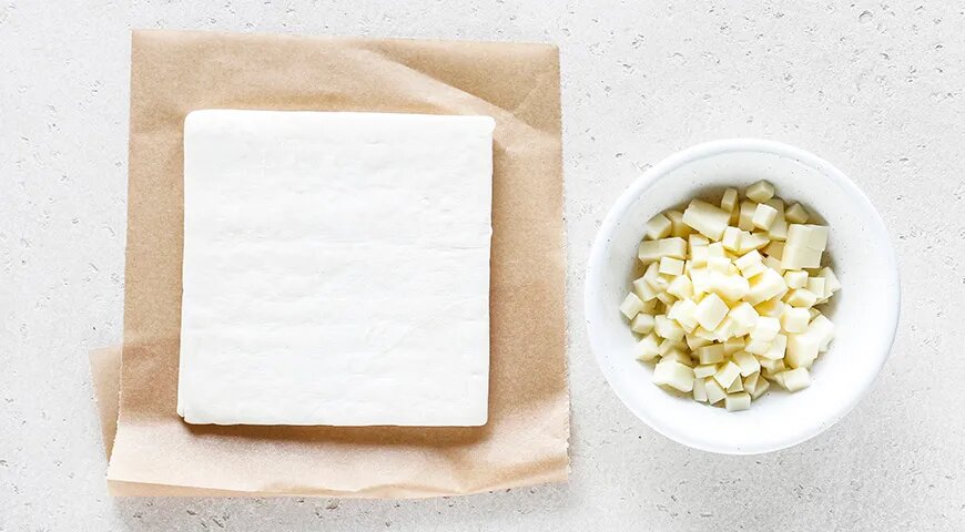 Перед началом кулинарного процесса рекомендуется подготовить все ингредиенты. В первую очередь, если тесто замороженное, его следует разморозить, чтобы с ним было легче работать. Сыр сулугуни можно нарезать небольшими кубиками или натереть на крупной терке для удобства. Противень следует застелить пергаментной бумагой.