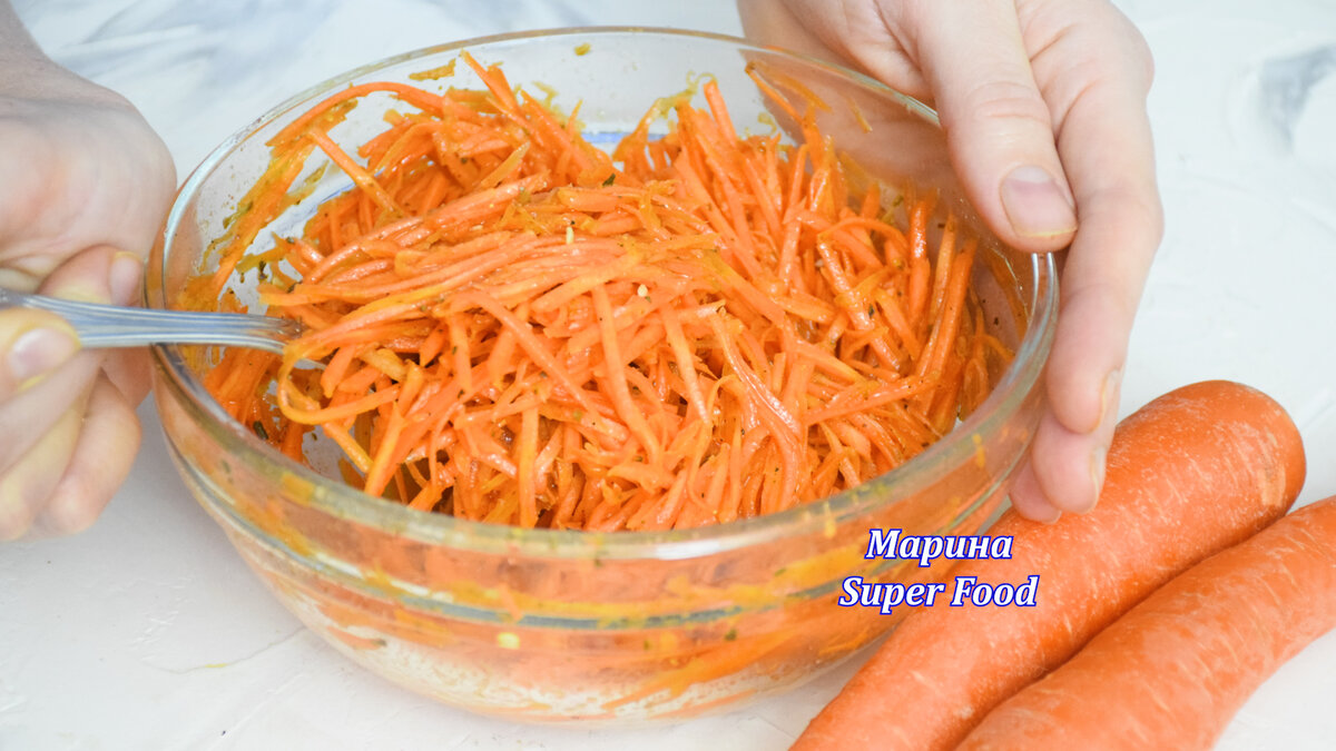 После этого в натертую морковь добавьте приправу для моркови по-корейски, перемешайте и оставьте на столе на 15 минут, чтобы овощи пропитались ароматами.
