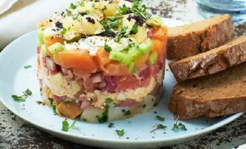 Лук замариновать, смешав его с сахаром и уксусом, и оставить на 12 часов. Огурцы нарезать мелкими кубиками, смешать с красным лососем и подождать, пока уйдет лишняя жидкость. Затем все ингредиенты аккуратно выложить слоем, украшая сверху икрой и зеленью. Кроме того, салат можно оставить в холодильнике, чтобы он настоялся и стал еще вкуснее.