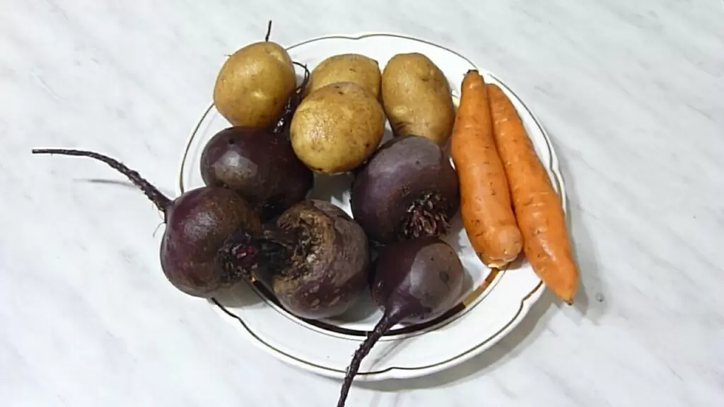 После 20 минут проверьте готовность картофеля, проткнув его вилкой или зубочисткой. Если он мягкий, выньте его, оставив морковь в кастрюле. Проверьте морковь через 40 минут; если она также готова, достаньте все готовые овощи. Свеклу стоит проверить на мягкость, она может вариться от 30 до 50 минут в зависимости от размера и сорта.