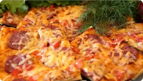 Пиццу помещают в предварительно разогретую до 180 градусов духовку на 15 минут. Готовое блюдо порадует хрустящей, но при этом сочной основой, вкус которой напомнит слоёную пиццу, но будет ещё насыщеннее. Ваши гости будут приятно удивлены неожиданным ингредиентом основы.