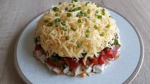 Начать с первого слоя: выложите яйца, слегка посолите и полейте майонезом. Далее добавьте второй слой — нарезанную куриную грудку. На третий слой кладите помидоры и зеленый лук, добавляя майонез. Завершите салат четвертым слоем из сыра. Украсить блюдо можно оставшимся зеленым луком или любимой зеленью.
