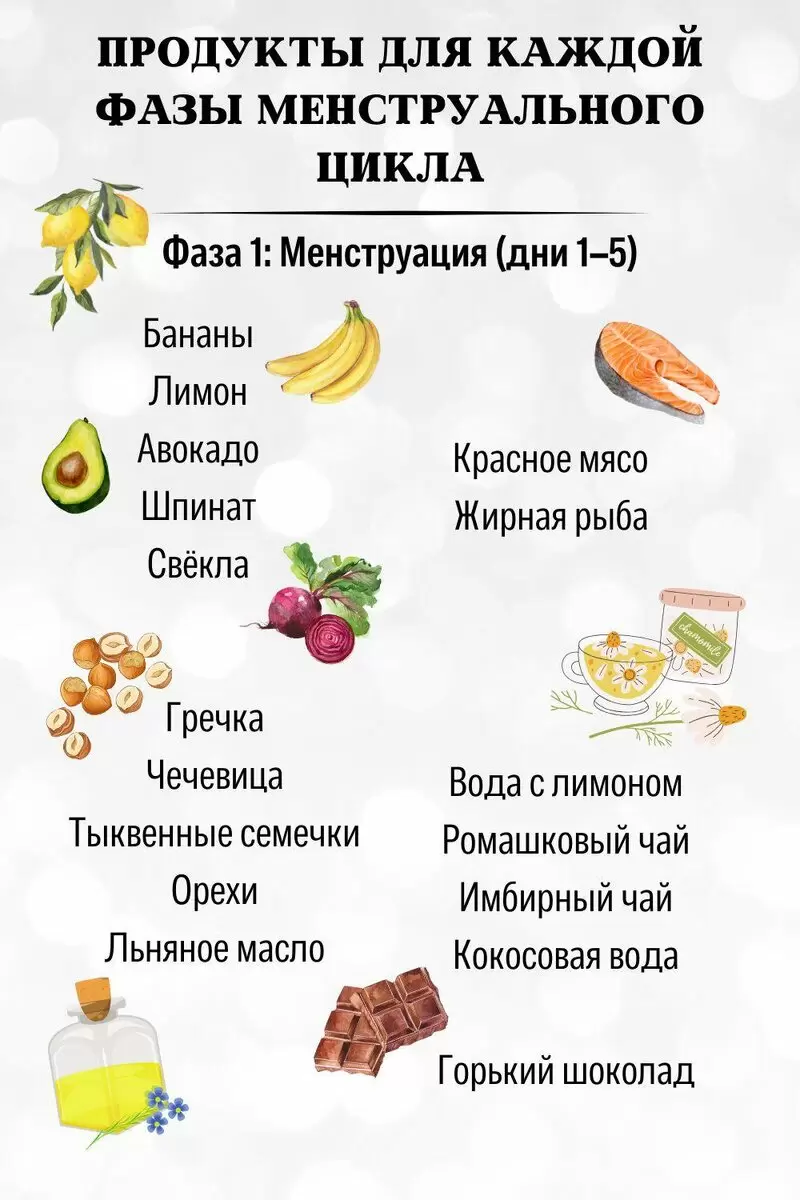 В первые дни менструации организм теряет кровь, что может снижать уровень железа и кальция. Важно обратить внимание на эти микроэлементы, чтобы поддерживать здоровье и самочувствие. Магний играет важную роль в работе нервной системы и помогает справиться с предменструальными симптомами.