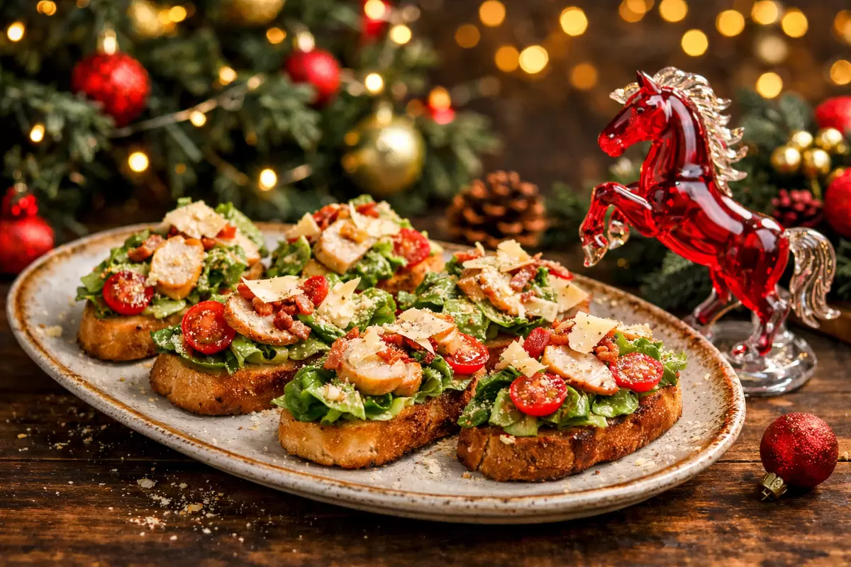 Секрет простой и яркой подачи — каждый ломтик хлеба превращается в мини-лактозную историю вкуса. Хрустящая основа, свежий салат и нежная начинка создают знакомую, но удивляюще лёгкую оснастку праздничного стола.